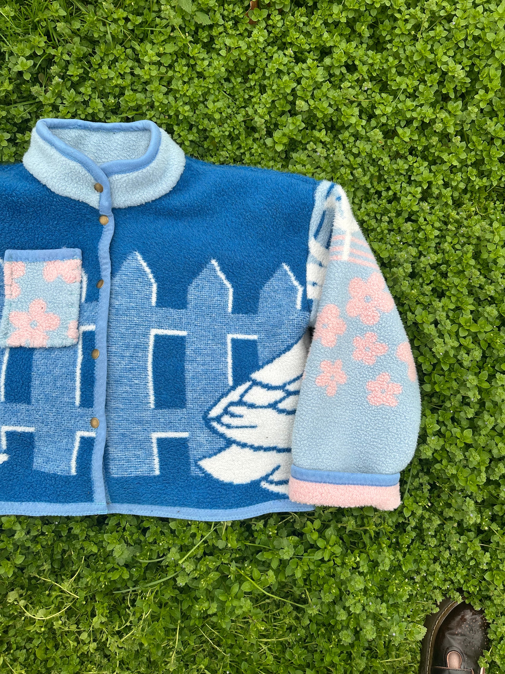 Upcycled vintage goose blanket coat with antique brass snaps. Super cute, comfy, and one of a kind.